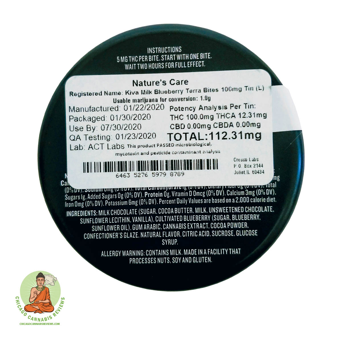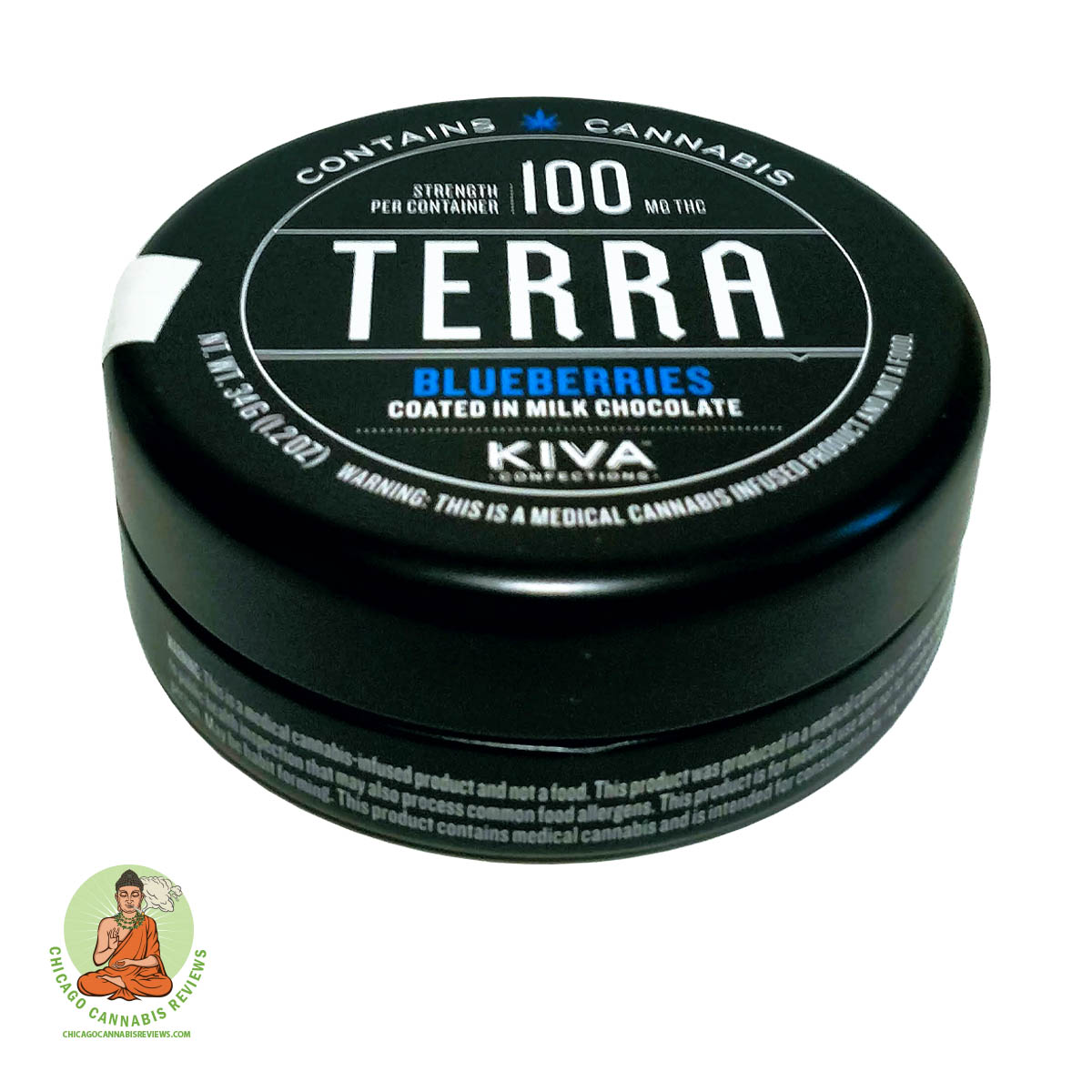 The Terra Bites come in a circular tin. The tin seems to be made of pretty thick metal — at least thicker than your standard Altoids tin, that’s for sure. It’s an attractive container, done up in black, with tall white text indicating the brand, THC content, and other info, while “Blueberries” and the cannabis leaf up top are printed in blue.