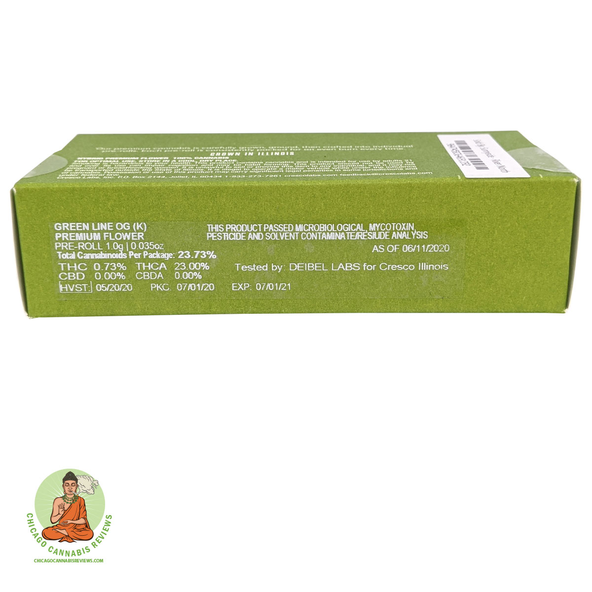 Greenline OG is an evenly balanced hybrid developed by Cresco Labs for the Illinois cannabis industry. It is a cross between Lime Skunk and Ghost OG. This 1 gram pre-roll had a moderately high THC content of 23.73%.
