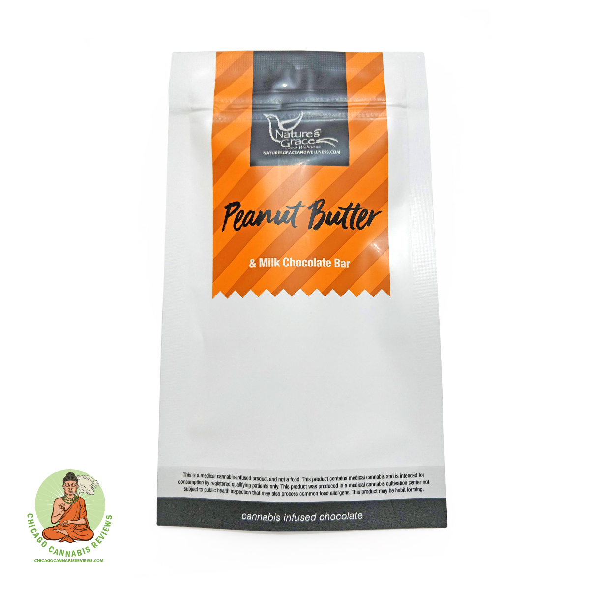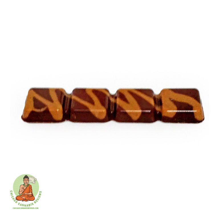The peanut butter and milk chocolate bar comes wrapped in gold-colored foil and is placed in a zip-sealed pouch. The pouch has a child-proof seam that you must pinch both sides of to open. The bar has an appealing swirl of peanut butter brown through the chocolate, which I thought was a nice touch. It’s perforated into five evenly sized pieces for easy dosing, which I also appreciated. Overall, it has the look of a professionally made product, which lends credibility to the manufacturer, Nature’s Grace and Wellness, and made me feel like I could confidently dose a piece for myself.