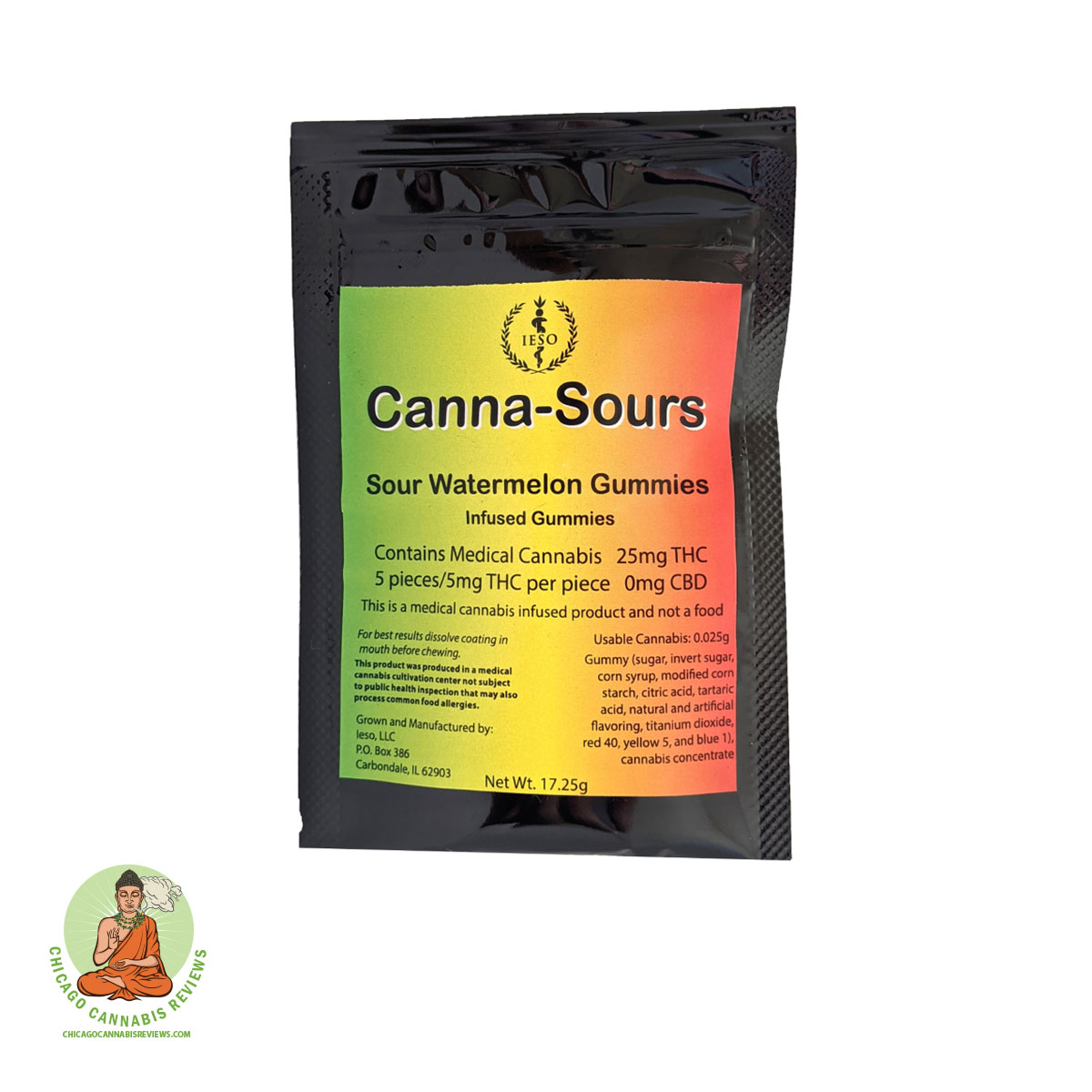 The Sour Watermelon Gummies from Canna-sours, a brand from IESO, includes five 5mg THC watermelon-flavored gummies.